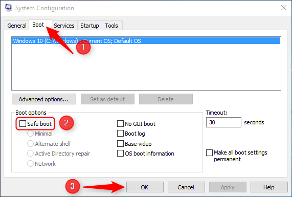 - Go to the Boot tab, check the Safe boot option, and click OK.